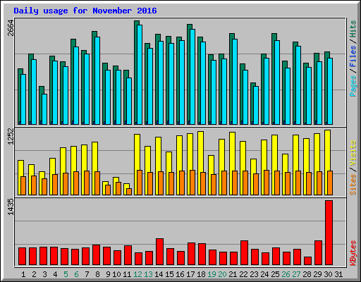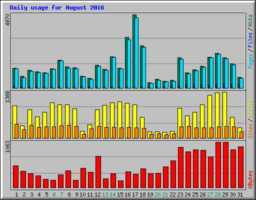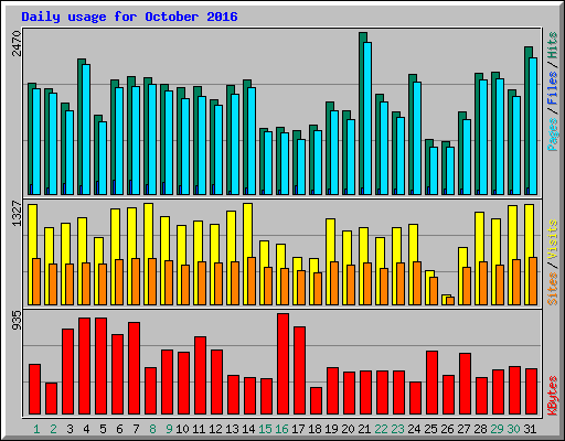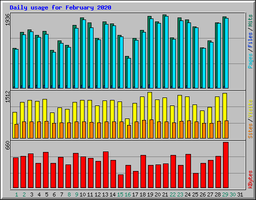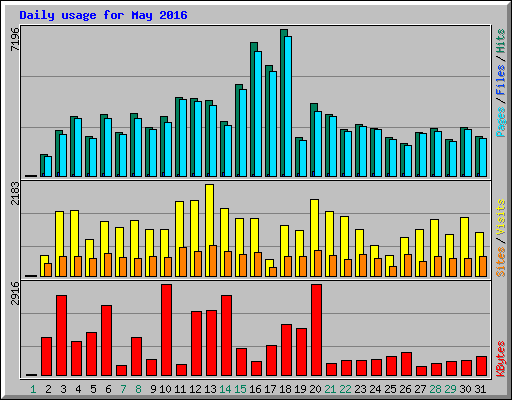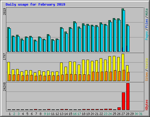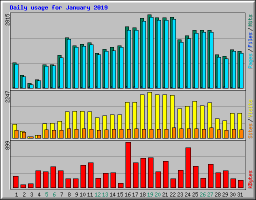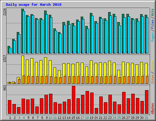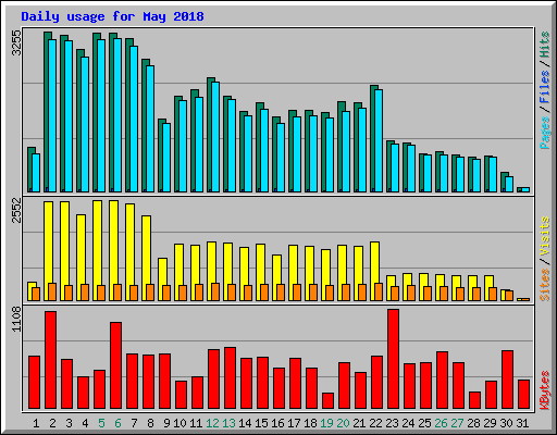| Day | Hits | Files | Pages | Visits | Sites | KBytes | ||||||
