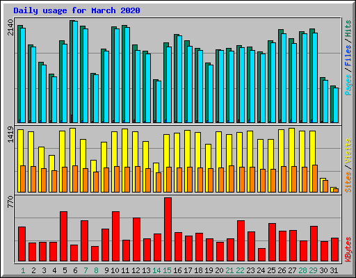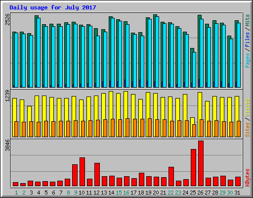 | Day | Hits | Files | Pages | Visits | Sites | KBytes | ||||||